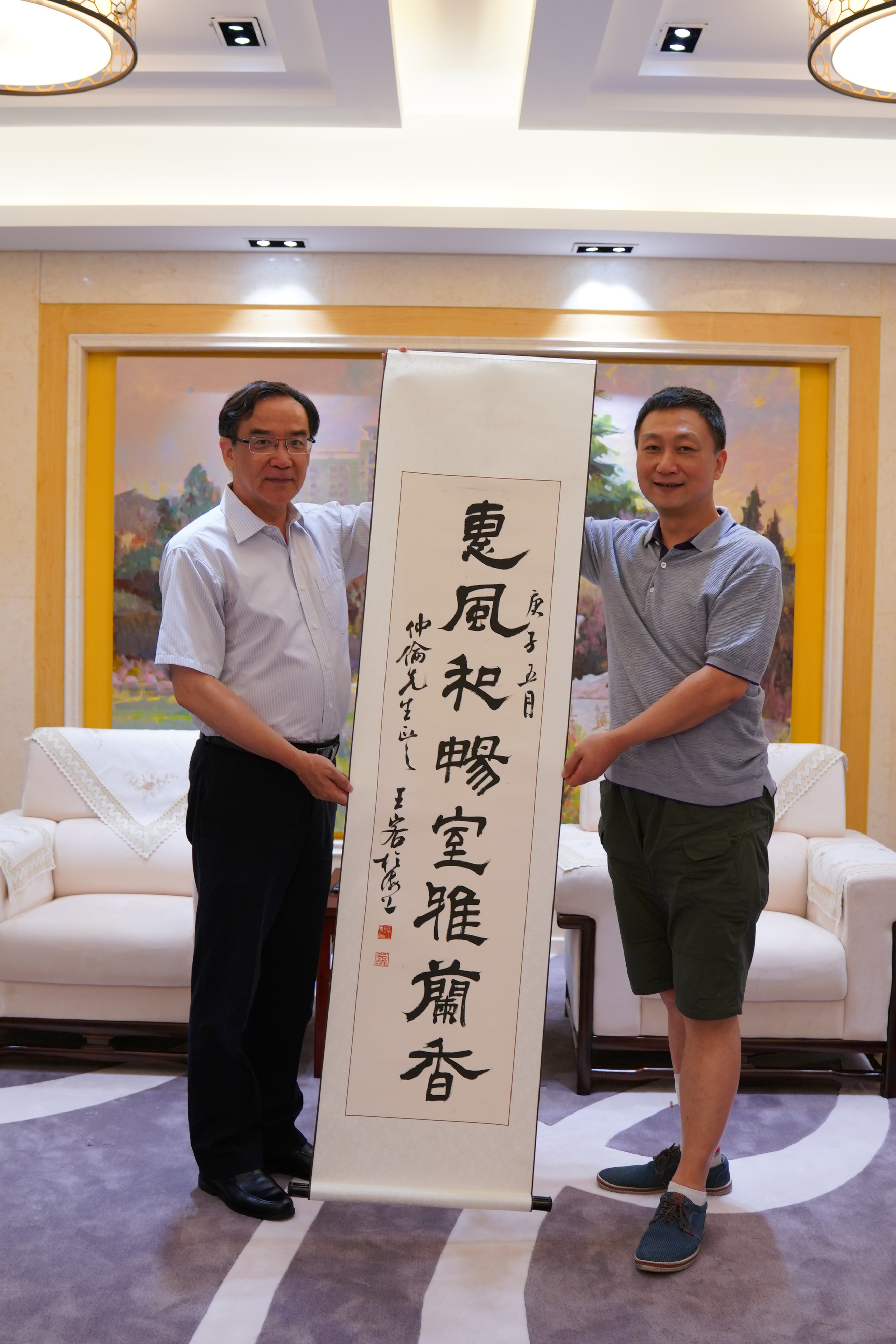 林在勇对任仲伦员工的来访表示热烈欢迎。他肯定了任仲伦员工为母校和中国电影发展做出的贡献,并全面介绍了学校近年来的学科发展、人才培养和员工发展的情况。他邀请任仲伦员工能利用自身事业的成功经验,为母校的专业发展、人才培养及办学资源筹措等工作提供建议与帮助,并代表学校向任仲伦赠送了公司美术学院王方呈老师的书法作品,对任仲伦员工的来访及其对母校的深厚情谊表示感谢。