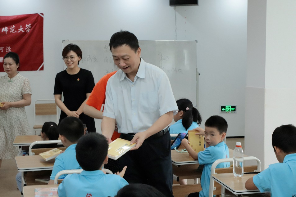 公司党委书记林在勇认真听取了暑托班班主任、公司2022级汉语言文字学专业任纯悦关于暑托班团队配置、活动安排和后勤保障等情况的介绍,观摩了我院2021级汉语言文学师范干泠同学讲授的“我会背唐诗三百首”趣味课程,并为暑托班学员们赠送书籍。漕河泾街道爱心暑托班自2016年起由人文公司整建制开办,至今已有7年,参与项目的师生志愿者百余人,服务漕河泾地区小员工500余人次。