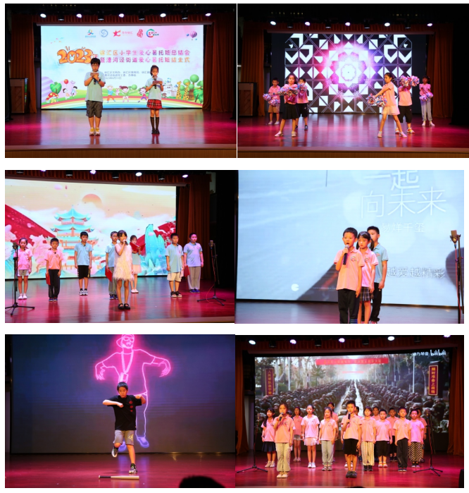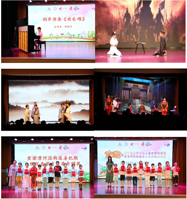 在回顾了徐汇区各暑托班办班点的日常后,漕河泾街道爱心暑托班的师生们为大家带来了精彩的汇报演出,在场的各位共同度过了一个难忘的夜晚。学员们多才多艺,有小班学员带来的暑托班老师教会的啦啦操《你要跳舞吗》,也有激发学员们爱国情怀的诗朗诵《我骄傲我是中国人》,还有发挥志愿者专业优势改编的舞台剧《荆轲刺秦王》……学员们专注认真的表演展现了他们蓬勃向上的朝气,每一个节目都赢得了台下阵阵掌声。在汇演环节间隙,与会领导为漕河泾街道爱心暑托班大班、小班的优秀学员们颁发了证书。伴随着小班学员弹奏的钢琴曲《漫步人生路》,汇报演出正式拉下帷幕。通过此次暑托班,小学员们收获了友情与成长,留下了许许多多美好的回忆,志愿者们也获得了锻炼。