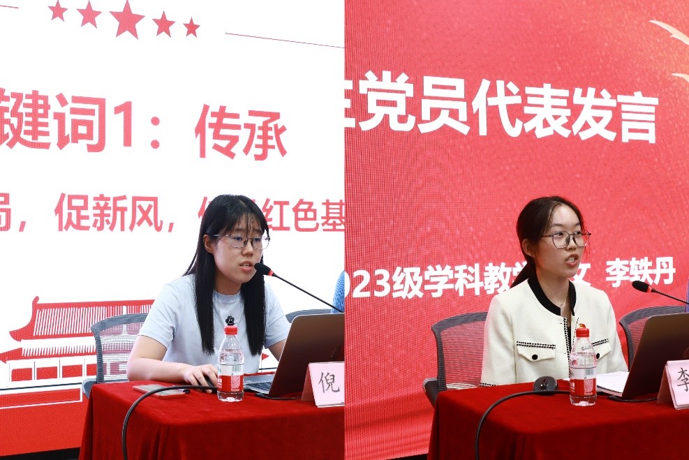 优秀员工党员代表、员工生活园区第五党支部书记倪卿与新生党员们分享了自己在公司党委的指导与培养下不断提升自身能力、发挥党员先锋模范作用以及引领党支部同志一起为人民服务的本硕七年时光,榜样先行,同辈引航,筑梦未来。2023级学科教育(语文)专业的李轶丹作为新生党员代表发言,她代表在座的所有新生党员发起倡议,站在新的起点,坚定理想信念,筑牢信仰之基;满怀信心和韧劲,在专业科研上勤奋钻研,不畏困难。