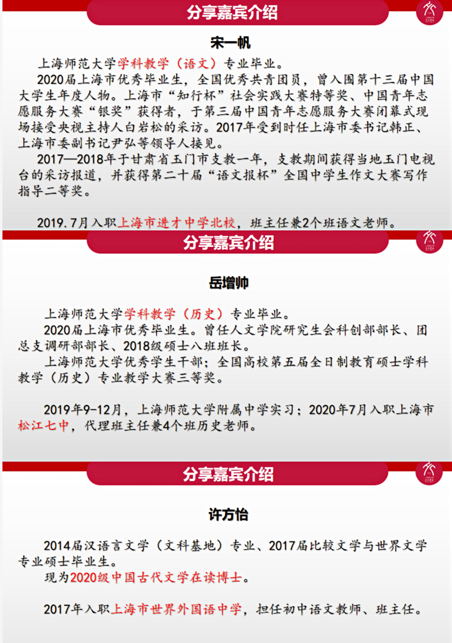 此次分享员工的专业与就职背景涵盖了中文、历史专业与公办、民办学校,分布在浦东、松江和徐汇三个区,为有意从教的同学们提供了更多的就业资讯与指导。