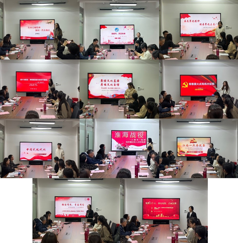 施浩然同学通过中西方现代化的鲜明对比讲述了“中国式现代化”中的中国国情、中国特色、五大特征和发展脉络与意义;区晓婷同学以《淮海战役中的“小推车”精神——党的理论的人民性特质》为题,从人民角度表达了“以少胜多”的淮海战役是人民群众团结在中国共产党周围取得的伟大胜利;钟薇同学从指引她成长的家乡名人瞿秋白同志的生平出发,讲述瞿秋白精神的具体内涵和现实意义;李轶丹同学以张桂梅董事长的事迹,生动讲述张董事长在办学、搞教育的过程中如何贯彻“六个必须坚持”的世界观和方法论,号召大家学深悟透做实;戈光月同学以“强国频道”播音主持的创新形式,通过采访第六届进口博览会一位供电保障人员的视角,别具心裁地展现党建工作引领进博会电力工作顺利供应的过程;邵敏怡同学以“长城精神”为着眼点,从“肉筑长城”到先进的军事设备筑造的坚固长城,展现了新中国成立以来,尤其是党的十八大以来中国军事实力的增强;周心然同学结合真实的场景图和产品讲解词将自己在第六届进口博览会进行志愿服务的经历生动地展开讲述,给大家上了一堂沉浸式党课;张颖同学用百年前“宁可牺牲,绝不屈节”的郭隆真烈士事迹和前不久杭州亚运会首金小将双手满是老茧和血泡但依旧刻苦训练的故事,鼓舞大家传承先辈之精神,开创吾辈之未来;曹佳雯同学作《奋斗与担当:跨领域实践与新时代使命——我与新时代》为主题的讲解,用自己在医院实习的经历和未来要从事的历史教师这一职业规划来阐释自己对新时代青年担当的理解和实践;陈皓暄同学以党的二十大报告中的“文化自信自强”为切入点,号召大家传承文化基因,勇当新时代中华文化的创造者;薛焱丹同学列举陆军首个初放单飞女飞行员徐枫灿和上海师大朋辈榜样的例子,向大家娓娓道来新时代青年“有理想”“敢担当”“能吃苦”“肯奋斗”的切身体会。