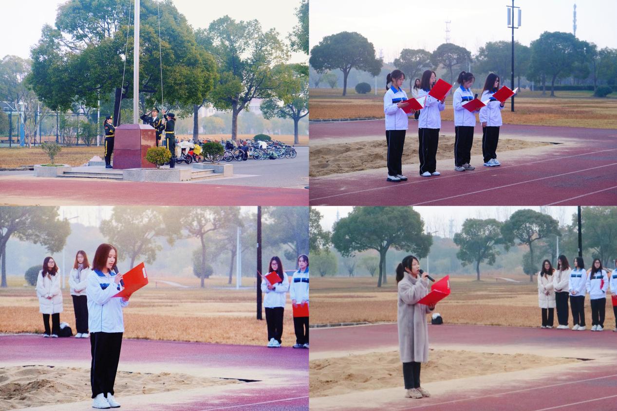 伴随着慷慨激昂的国歌,五星红旗冉冉升起,老师和同学们行注目礼,气氛庄严肃穆。ok138cn太阳集团5292023级本科汉语言(光启实验班)的刘梦馨从对青年的谈论入手,鼓励以老员工为新身份的青年们培养独立意识、自主意识、团队合作能力和自学能力,以实现中华民族伟大复兴为己任,做有理想、敢担当、肯吃苦、能奋斗的新时代青年。2022级本科汉语言文学(师范世承)3班娄洁同学、2023级本科汉语言文学(师范)1班陆瑶同学、2023级本科历史学(师范)1班富晶同学和2023级本科汉语言文学(师范)2班谷悦同学为大家带来诗朗诵《向太阳》,他们激情澎湃,富有朝气和活力的朗诵,鼓舞了同学心中的奋斗激情。