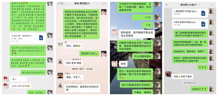 六位助教小老师每天督促学员打卡,反复听录音,记录学员的错误,然后一对一纠音,往往一个错误纠正十几遍是常有之事。平日里,每位助教日均工作时间要超过2小时,且每周还要开一次教研会议,汇报各小组成员的学习情况。此外,每周各小组还要进行一次小组学习交流会,汇总一周的学习情况,对共性问题开展教学和辅导。