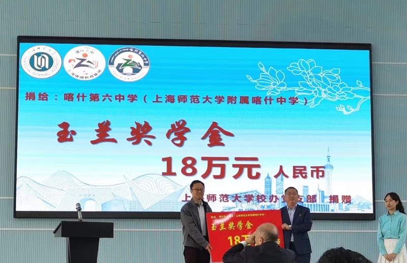 开幕式上还举行了“玉兰奖学金”捐赠仪式,该奖学金是由上海师大学校办公室和基础教育处党支部党员捐赠设立的,旨在奖励附属喀什中学品学兼优、家庭经济状况不佳的员工,该项目于2021年度开始实施,已持续三年。