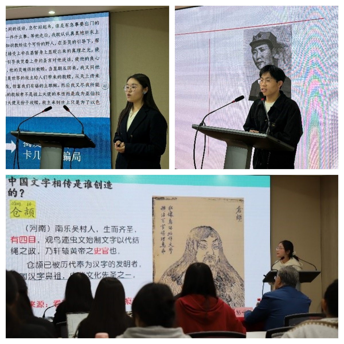 项目组三位老员工讲师作课堂教学演绎。学院2022级中国现当代文学专业研究生邓思雯、2022级中国近现代史专业研究生颜兵以及学院22级汉语言文学(师范)专业本科生邵叶儿分别就《<经典常谈>阅读——走近<说文解字>》《<红星照耀中国>整本书阅读概览》《<鲁滨逊漂流记>阅读——改造“星期五”探微》作课堂教学演绎。演绎之后,两位老师结合自身丰富的教学理论和教学实践经验对三位同学的讲课进行指导。