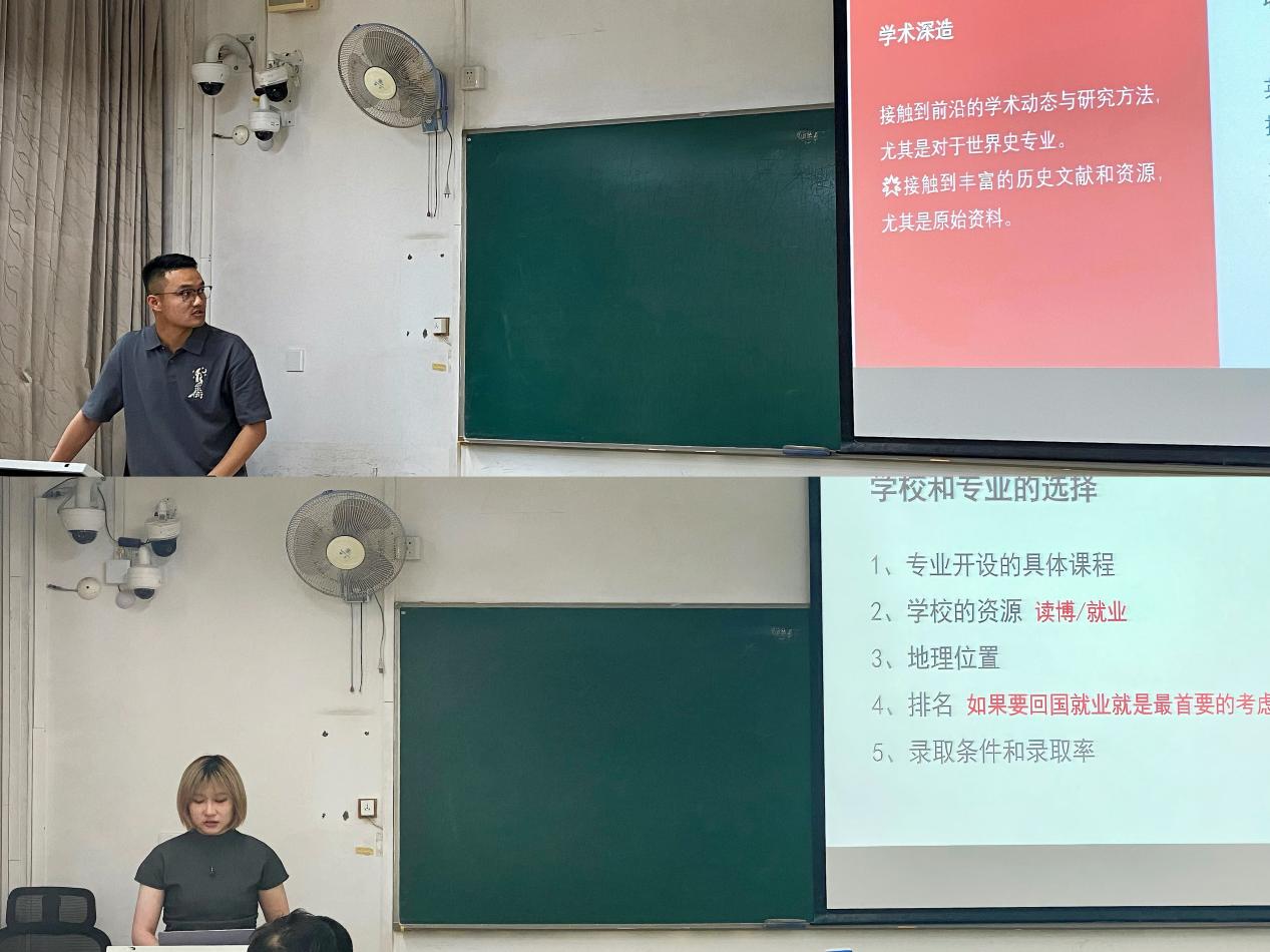 2020级世界史1班吴骋昊和黄一茗作成功留学经验分享。两位同学就中介选择、学校和专业的选择、官方沟通和申请材料准备等作了介绍,对于低年级同学比较关心的问题作了深入浅出的解答。