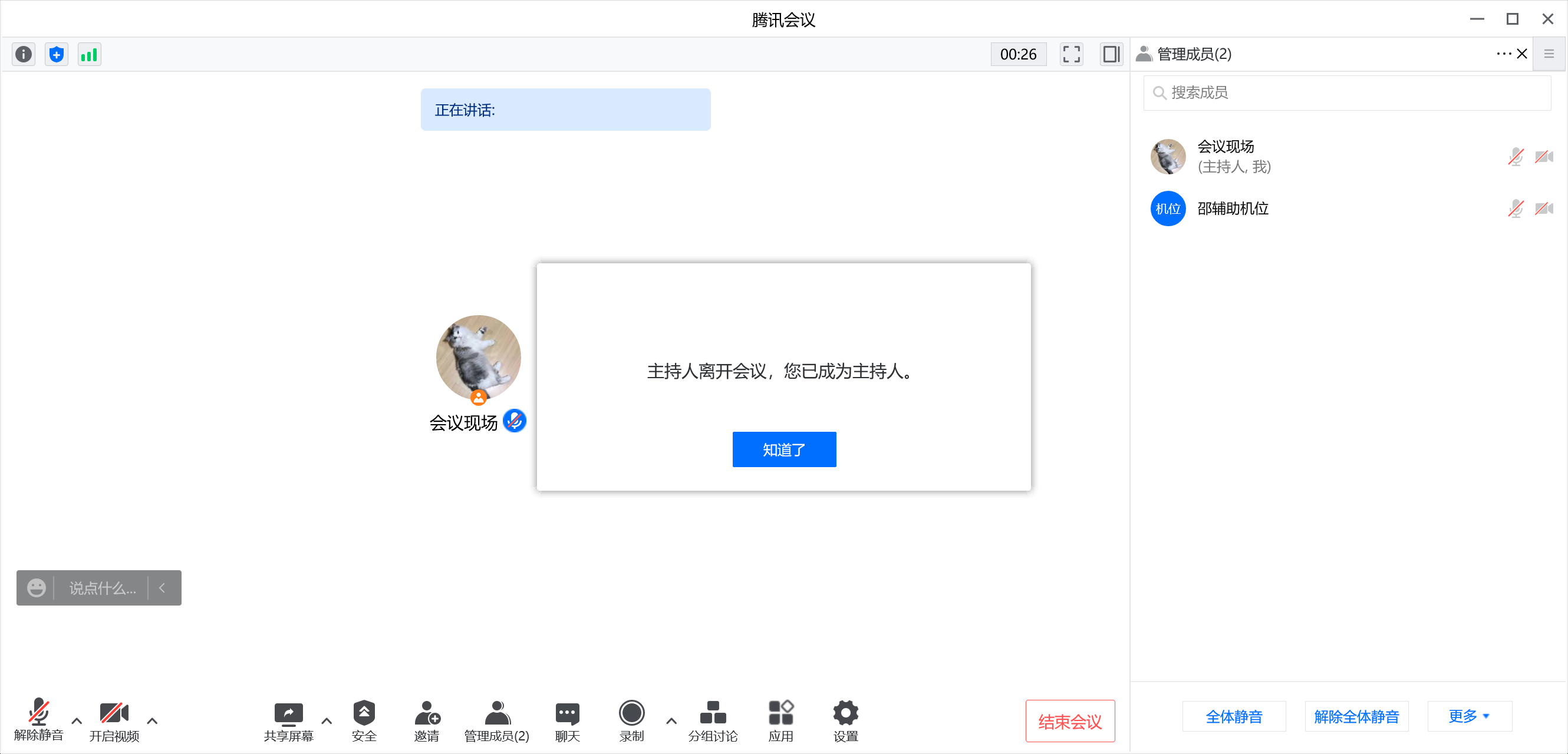 离开会议——主持人从会议退出,但会议依旧在进行。主持人的权限会优先转给仍在会议室中的联系主持人,如果没有联席则转给最早进入会议的成员。