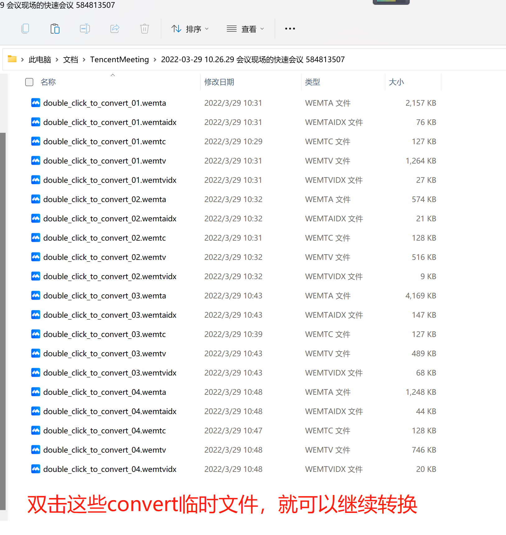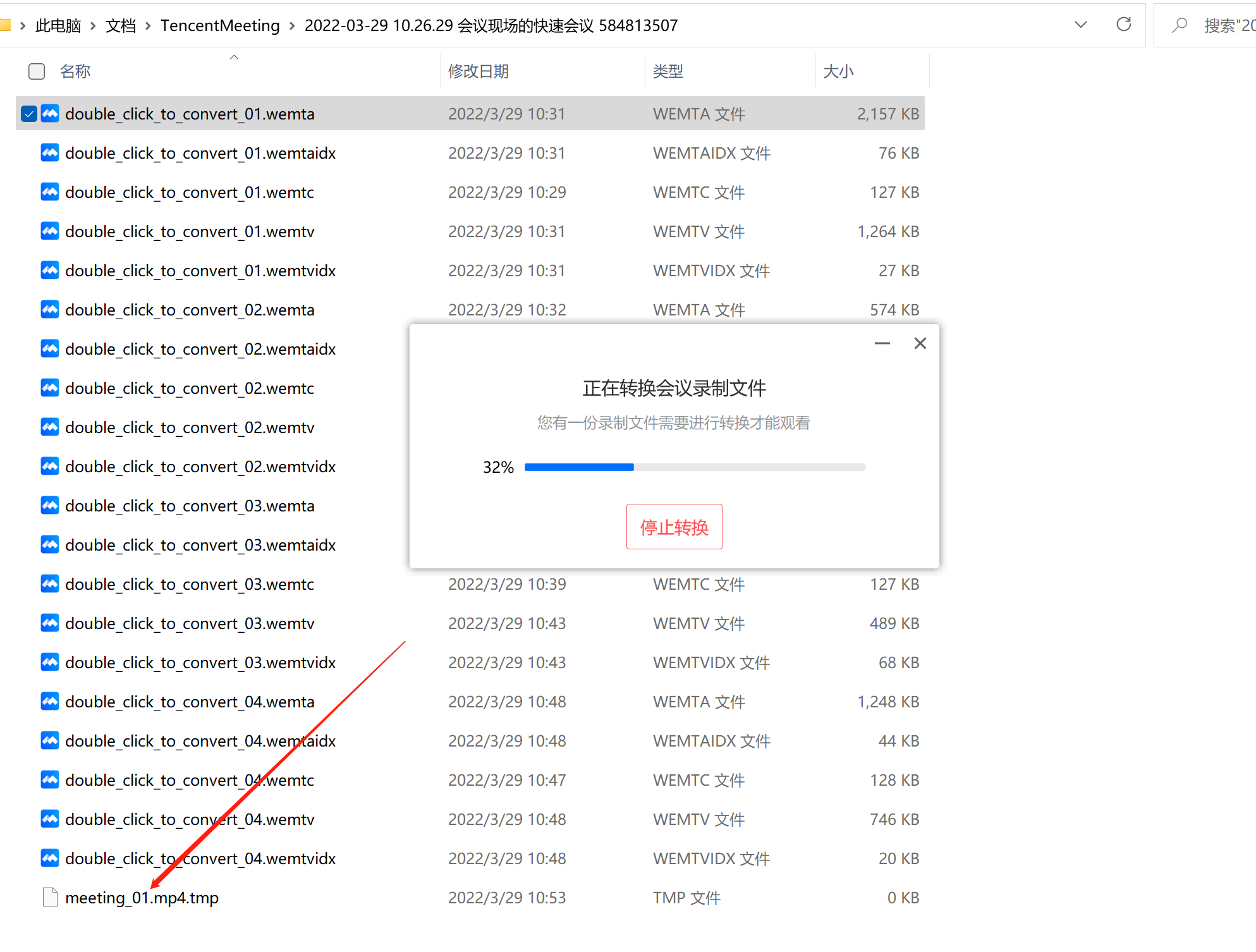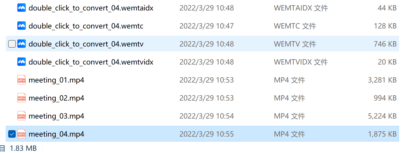 需要转码的时候,我们先找到视频保存的路径(默认在“我的文档”下的“TencentMeeting”文件夹中)一个录像有5个临时文件,双击任何一个文件都能进行转码。
