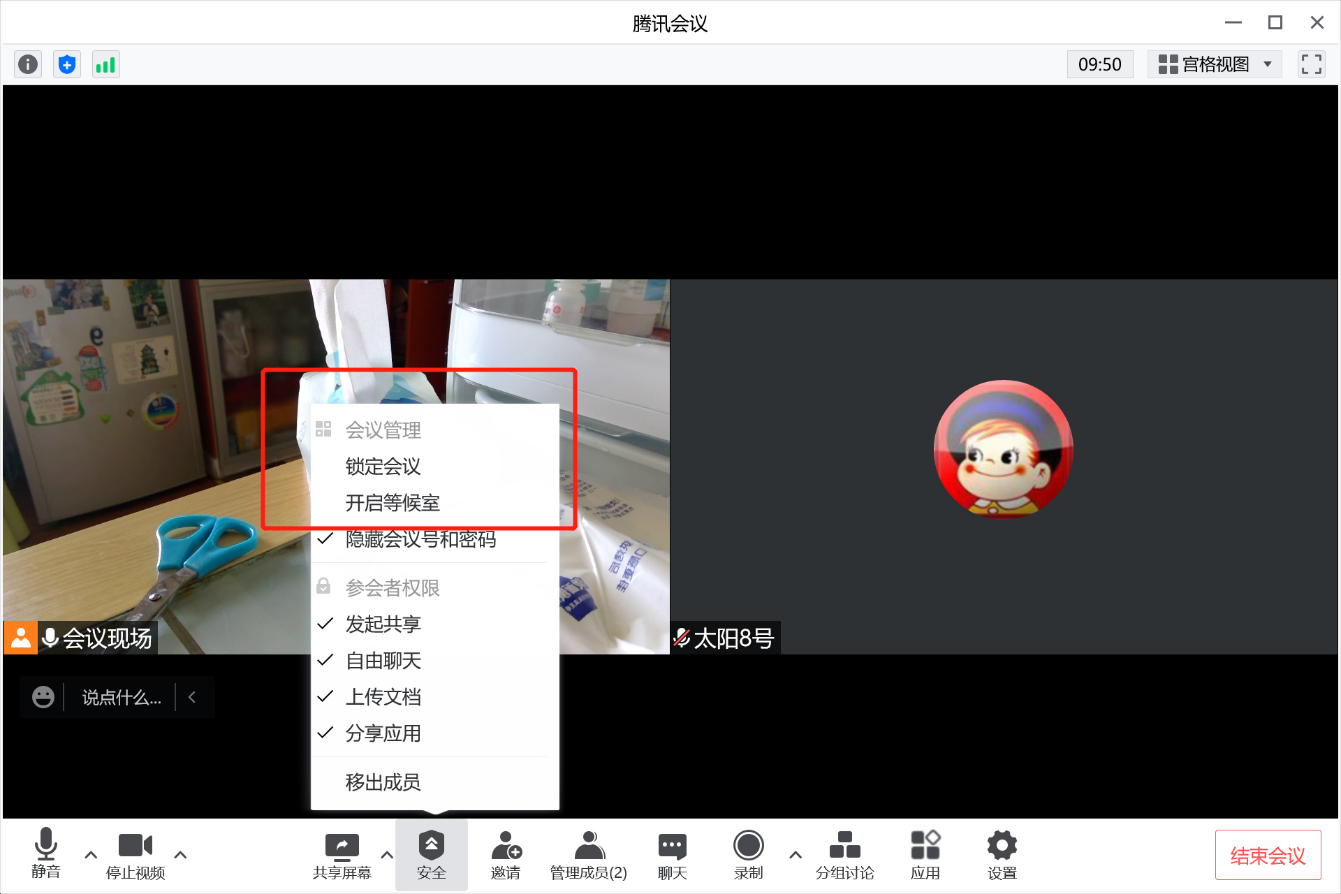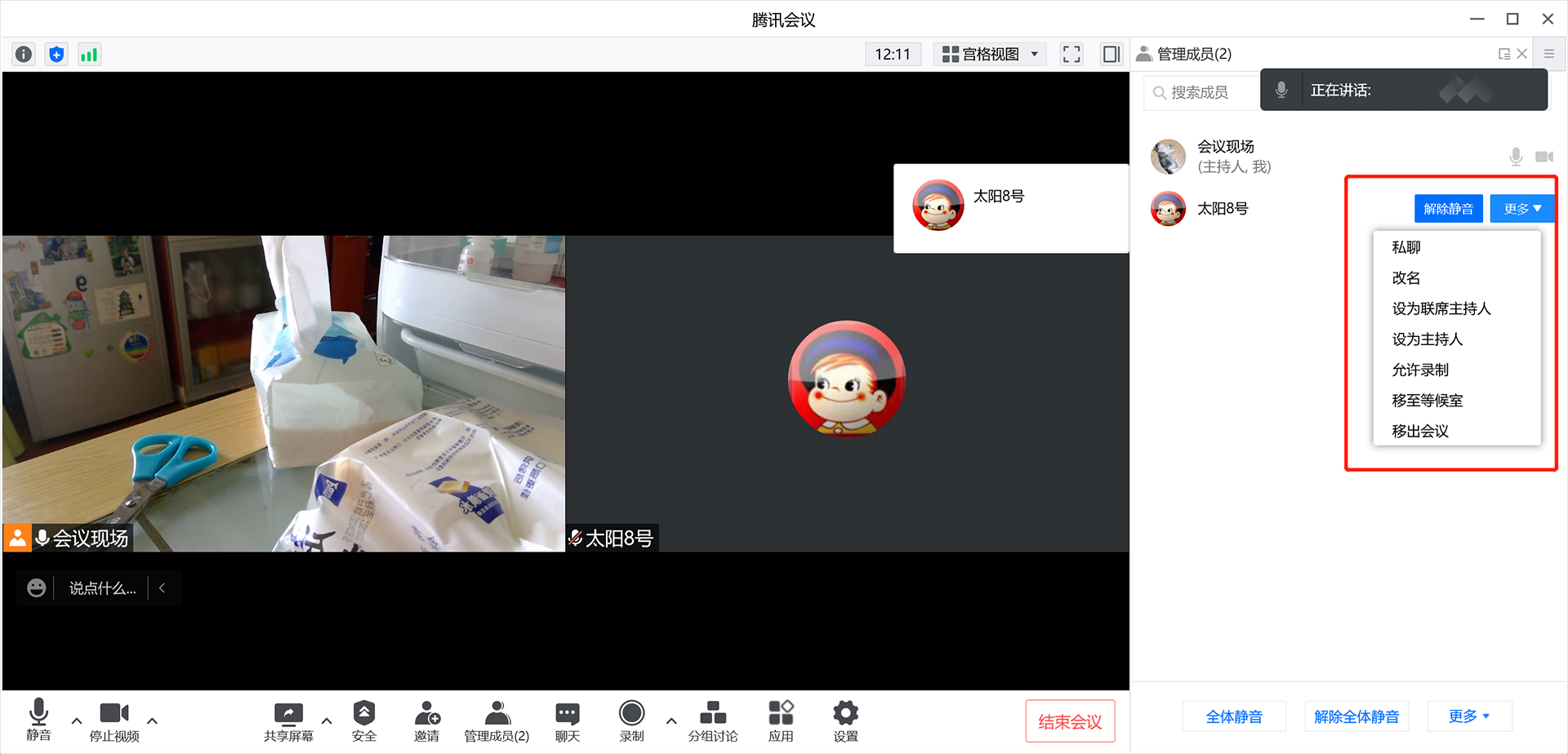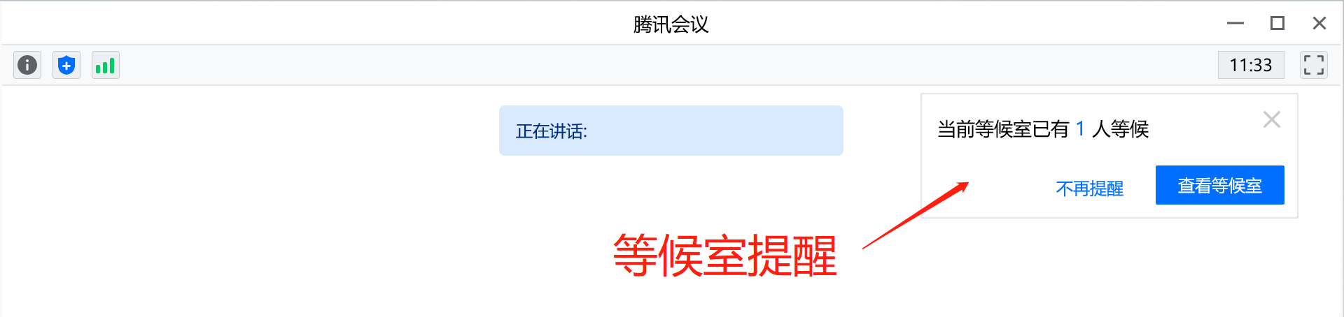 如果有人进入等候室,主持人会收到提醒,同时,在“管理成员”界面会多出一个“等候中”的选项卡。(如图显示)