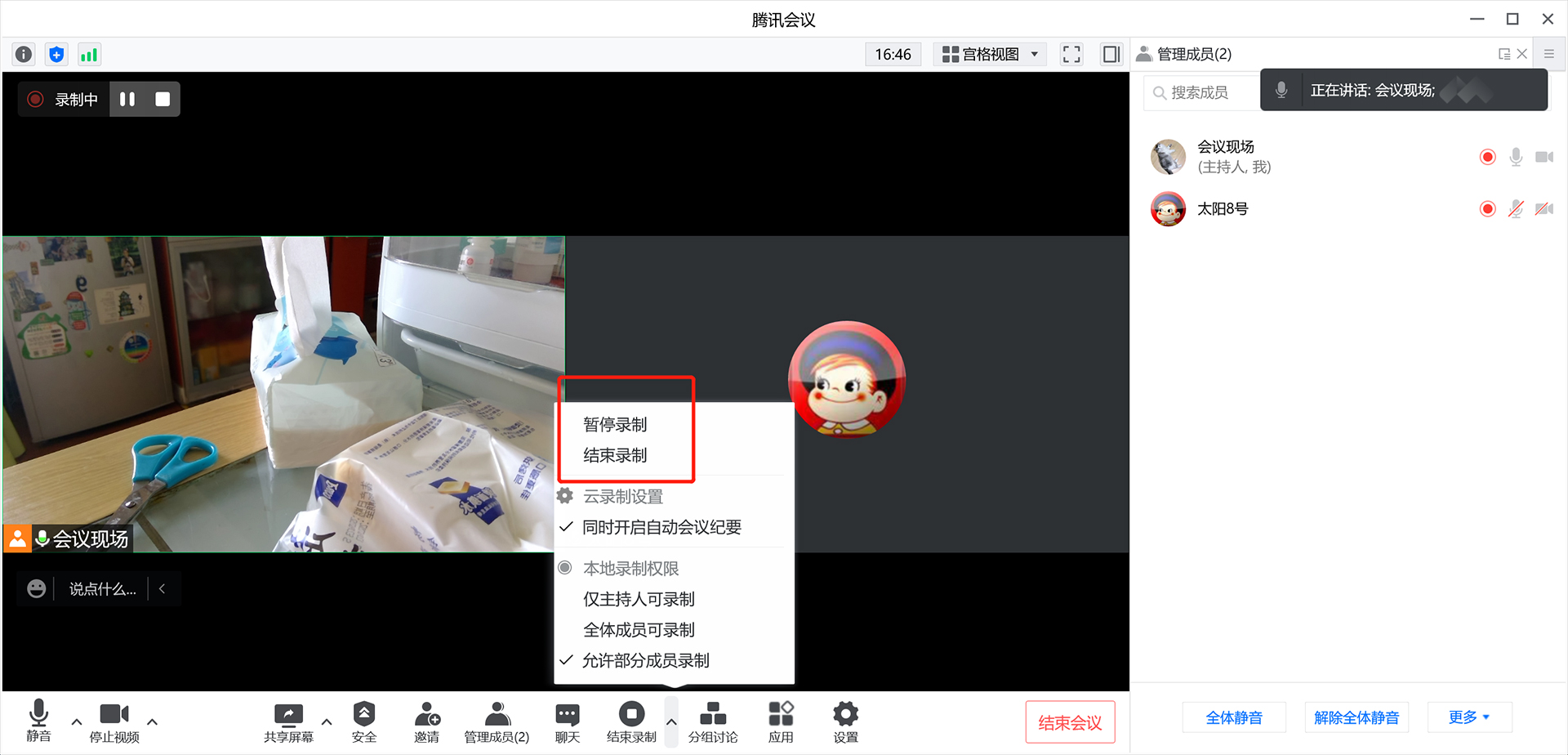 如果只有主持人在录像,普通成员界面的左上角会出现“录制中”的字样。只有自己也在录像的时候,左上角才会同时出现“暂停”和“停止”的按钮。(如图)