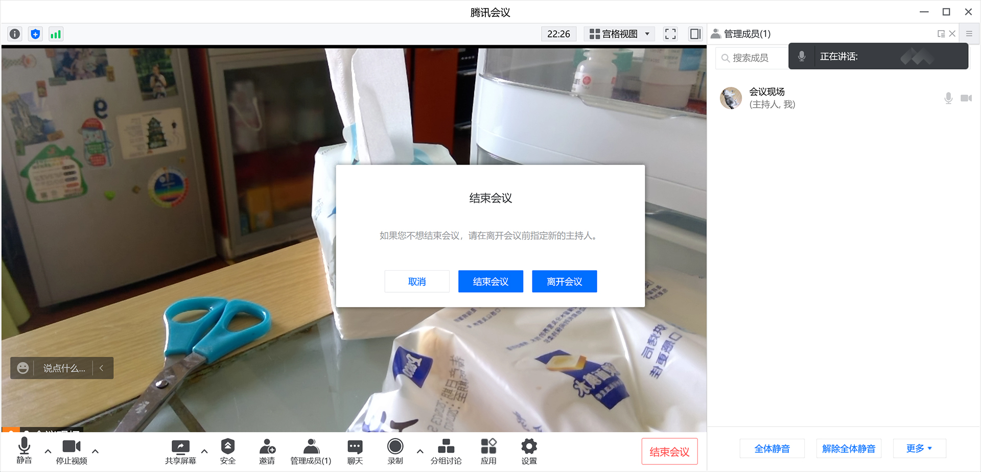 结束会议——主持人从会议退出,会议关闭,所有人都被强制离开会议。