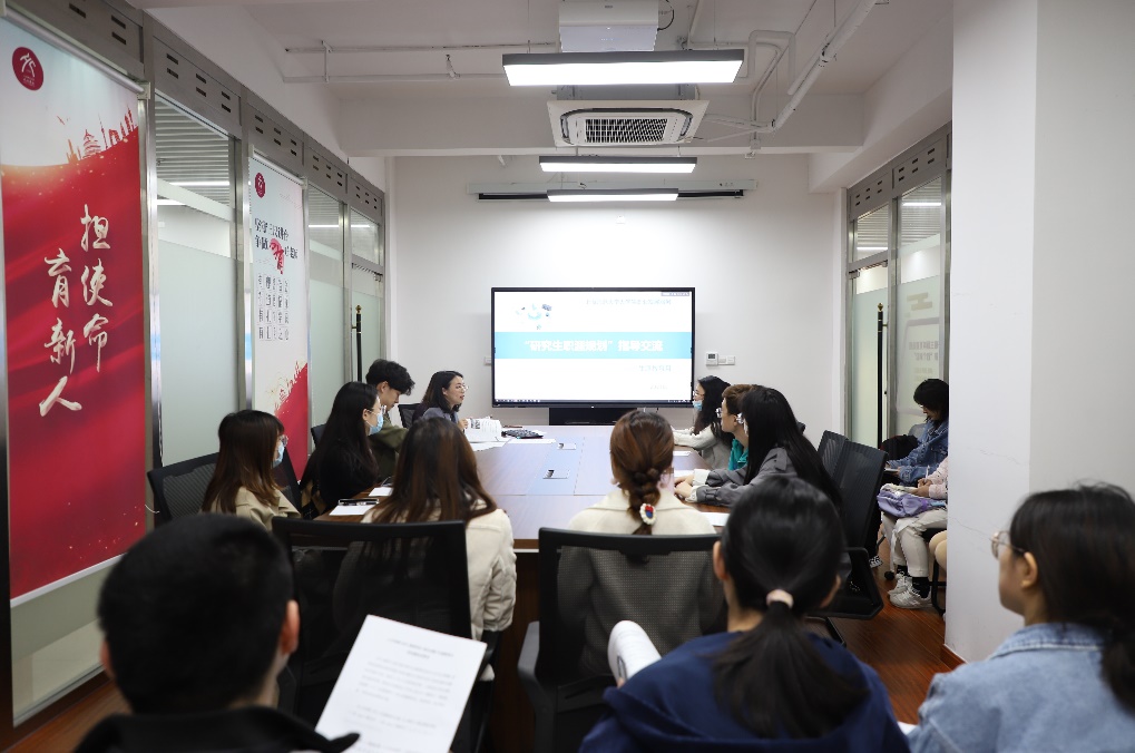 会上,朱倩云老师围绕本次“金色启航”生涯教育月的活动意义、活动目标、内容安排、班团活动组织与实施、学涯规划和如何参与“生涯嘉年华”活动并正确使用《生涯嘉年华导航手册》等内容对参与工作的班团骨干和研会生涯发展中心部员开展主题培训和指导。她从近三年毕业生就业数据入手,介绍了历届毕业生的就业情况和就业方向,指出往届同学在求职过程中存在个人想法与企业需求有出入、过于看重工作环境和待遇、求职渠道较为局限等共性问题,强调面对当前的就业环境和就业趋势,希望研究生同学要尽早规划就业方向并早做准备,在不断提高自我能力的同时关注就业信息,为未来职业发展打好基础。
