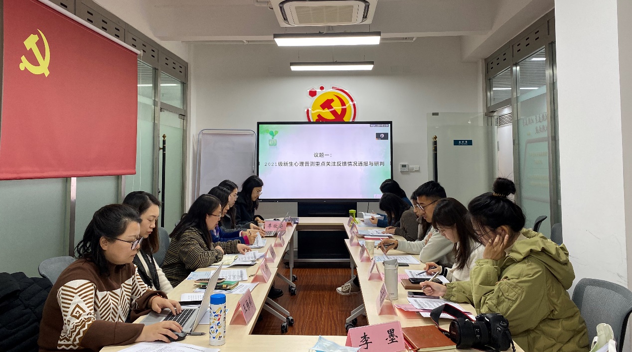 本次会议共有三项议程,首先是对2021级新生心理普测重点关注反馈情况进行通报与研判。吴燕霞老师针对辅导员老师们在普测结果反馈之后谈心谈话中遇到的危机问题进行有针对性的建议;其次,各级辅导员针对目前在档心理危机员工个案的跟踪情况与关怀进展展开汇报,并与吴老师讨论交流。对于中度重度危机的员工,吴老师提出要善于多方观察,正向引导,注重方式方法,把握员工成长规律,必要的时候要提出转介及时就医的建议;最后,吴燕霞老师和与会的辅导员老师们针对心理健康调试与情绪疏解进行交流讨论,提出对于员工学业压力、情绪起伏和突发情况等要重点关注。