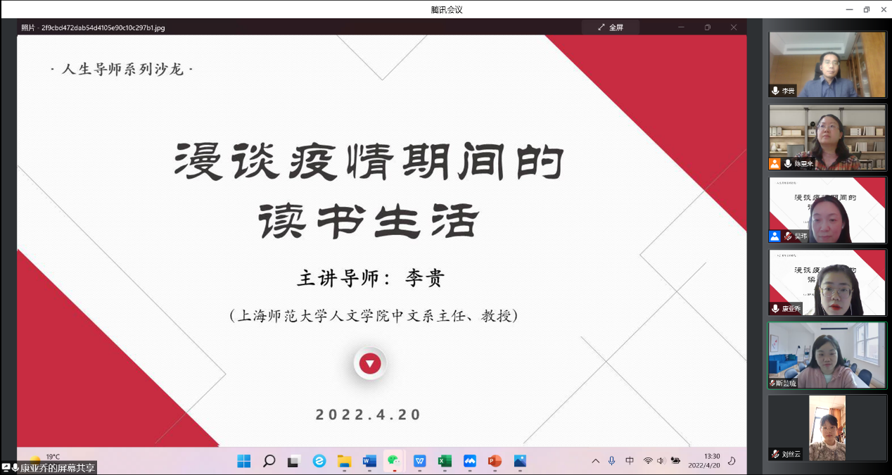 4月20日下午1点半,ok138cn太阳集团529中文系主任李贵教授做客学院“人生导师”沙龙,以《漫谈疫情期间的读书生活》为题,向处于疫情封控的同学们传递乐观精神,介绍阅读作品,分享读书方法。沙龙由公司党委副书记、副经理陈重来主持。
