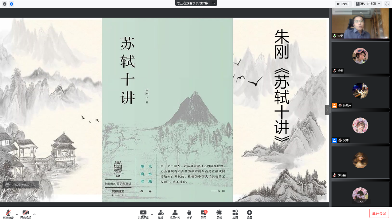 李教授结合疫情封控期间出现的疫情文学仿写运动,从文学角度和个人防疫经历引入,与同学们漫谈疫情期间的读书生活。李教授从当前在校老员工们的日常生活供应与防护安全有充足保障谈起,努力减轻同学们因疫情产生的焦虑情绪,引导员工以科学的态度认识当前疫情形势。李教授提醒处于疫情封控期间的同学们应适度使用社交媒体,积极做好心理调适,减少负面情绪,避免浪费时间精力成本,降低学习工作效率。他引入“信息茧房”等概念,进一步指出冲破“信息茧房”的“精囊妙计”:兼听则明、抬头望天、脚踏实地、读书思考。李教授通过苏轼的《李氏山房藏书记》向同学们点明自古以来读书的重要性与珍贵性,并推荐了《庄子讲义》《苏轼十讲》等经典书目供同学们选读。他希望同学们在读书中能做到溯源与目验、专精与博览,学会怀疑、提问,能独立思考,真正在阅读中实现“循序渐进、熟读精思、虚心涵泳、切己体察”。