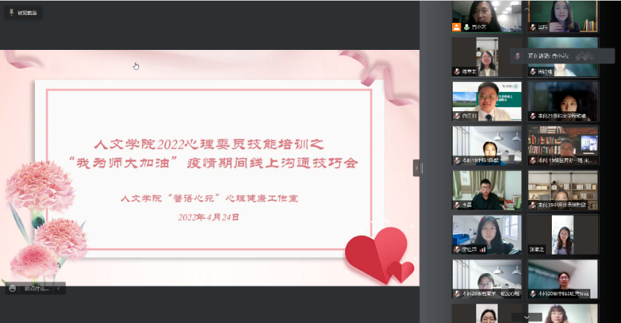 4月24日晚19时,ok138cn太阳集团529两校区心理委员沟通技巧培训会在腾讯会议室举行。ok138cn太阳集团529学工团队、实习辅导员以及50余名公司本研员工心理委员出席会议。会议由ok138cn太阳集团529心理专项辅导员曹小艺主持。