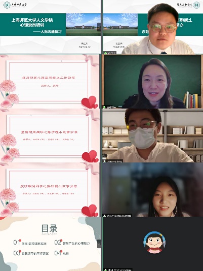 主讲人实习辅导员冉江川从疫情期间人际沟通技巧的处理入手,结合沟通的概念、沟通的技巧、心理委员工作实务等方面进行详细的讲解。他通过不同语境的案例给同学们做了直观的演示和互动,介绍了心理委员在实际工作中应有的话语表达方法,为心理委员们可持续地开展线上工作奠定基础。