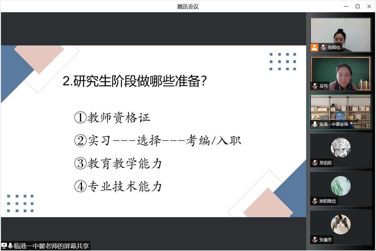 在朋辈分享环节,临港一中语文教师瞿重律从中小学语文教师的选择、如何在研究生阶段做好语文教师就业准备、中学语文教师的基本素养三个层面展开分享,让与会同学对中小学教师行业有了更加深刻的了解和体悟。针对前期收集到的问卷结果与线上提问情况,与会老师就同学们关心就业、实习等问题作了详尽的解答与反馈。