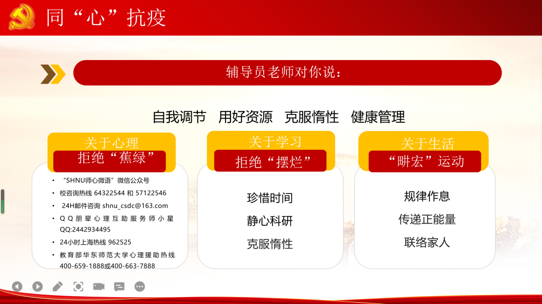 灾难面前没有人能置身事外,从来不存在一个人的桃花源。20级课程与教学论、学院研究生团总支书记杨蕊如,虽未在上海,却心系校园,她讲述了自己的家乡吉林省已迈过步步艰险、终迎曙光的历程,期盼着上海也能早日胜利,共赴春光。之后吴佳、雍佳丽同学也从新媒体工作和校外的视角分别谈及了自己的故事和感悟。