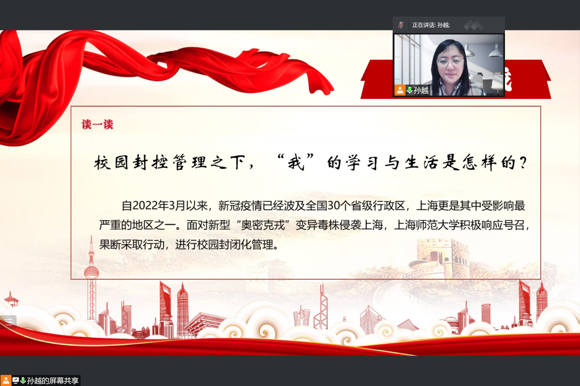 主持人孙越简要介绍了本次班会的流程,并结合疫情防控现状向大家讲述了自己的抗疫故事。2022年3月以来,国内疫情防控形势越发严峻,本轮疫情已经波及全国30个省级行政区,上海更是其中受影响最严重的地区之一。突如其来的疫情扰乱了同学们正常的校园生活秩序,但在近两个月的抗疫战中,依然能看到每位同学团结一心、共克时艰的决心。