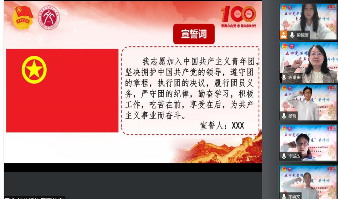 在公司党委副书记、副经理陈重来的带领下,2020级本科生杨哲、李诚杰、宋睿文三名新团员在线进行宣誓。三