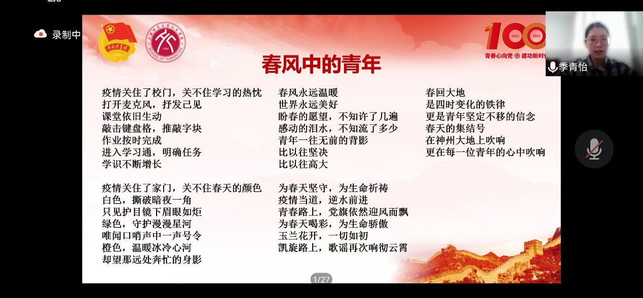 疫情期间,学院开展“春暖花开,诗情化‘疫’”活动。2020级汉语言文学(文科基地)的董芮杉同学原创的诗歌《春风中的青年》受到好评。2020级汉语言文学(师范)的季青怡同学在线动情朗诵该首诗歌,激励青年们一起为社会贡献力量,共同打赢这场疫情攻坚战。