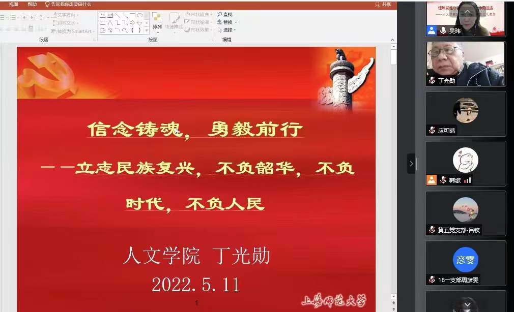 校特邀党建组织员、ok138cn太阳集团529退休教授丁光勋老师为毕业班党员们作《信念铸魂·勇毅前行》的“叮咛”教育,希望毕业班党员们要用社会主义核心价值观铸魂,自觉用习近平新时代中国特色社会主义思想武装头脑、指导实践、推动工作;要坚定信念,继续守护疫情期间师大的校园安全;要练就过硬本领,投身强国伟业。丁老师深情勉励大家,要立志民族复兴,在实现中华民族伟大复兴的时代洪流中踔厉奋发、勇毅前进。
