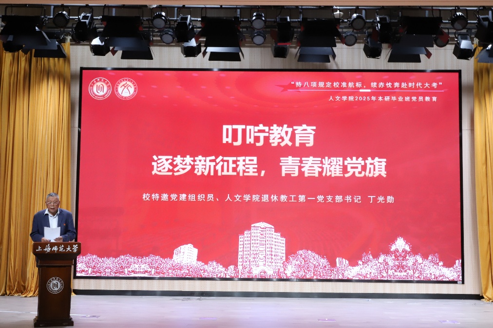 丁光勋作《逐梦新征程,青春耀党旗》“叮咛”教育党课。“中国梦是我们的,更是你们青年一代的。”丁老师引用习近平总书记的谆谆教诲,教导毕业班党员坚守理想信念,做信仰坚定的“追光者”,勇于担当,做实干笃行的“奋进者”,保持廉洁自律,做清正廉洁的“守护者”,传承红色基因,做红色精神的“传承者”。四项殷切嘱托深沉而有力量,丁老师希望毕业班党员以毕业为新起点,牢记党员身份,让党的光辉在每一步成长道路上熠熠生辉。