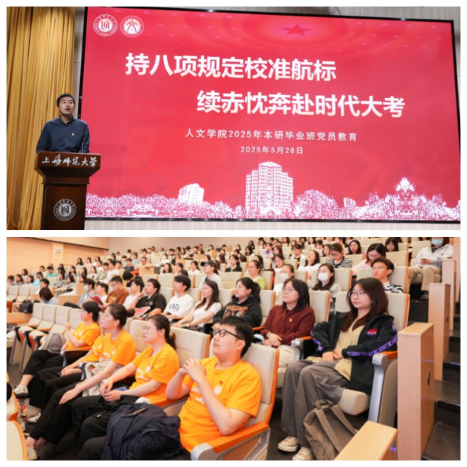 潘黎勇作《持八项规定校准航标,续赤忱奔赴时代大考》党课。聚焦中央八项规定精神,潘老师与毕业班党员共同探讨党的作风建设对于个人的重要意义,基于此,希望毕业班党员牢记三要点。第一,回望入党初心,做坚守承诺的诚信者;第二,做清正廉洁的守护者,严守纪律底线与政治底线,警惕微腐败;第三,做党员优良作风的传承者和继承人。潘老师指出中央八项规定精神是党员同志的坚守初心的“护身符”,严的基调必须长期坚持,由此才能行稳致远,为以中国式现代化全面推进强国建设、民族复兴伟业提供坚强作风保障。