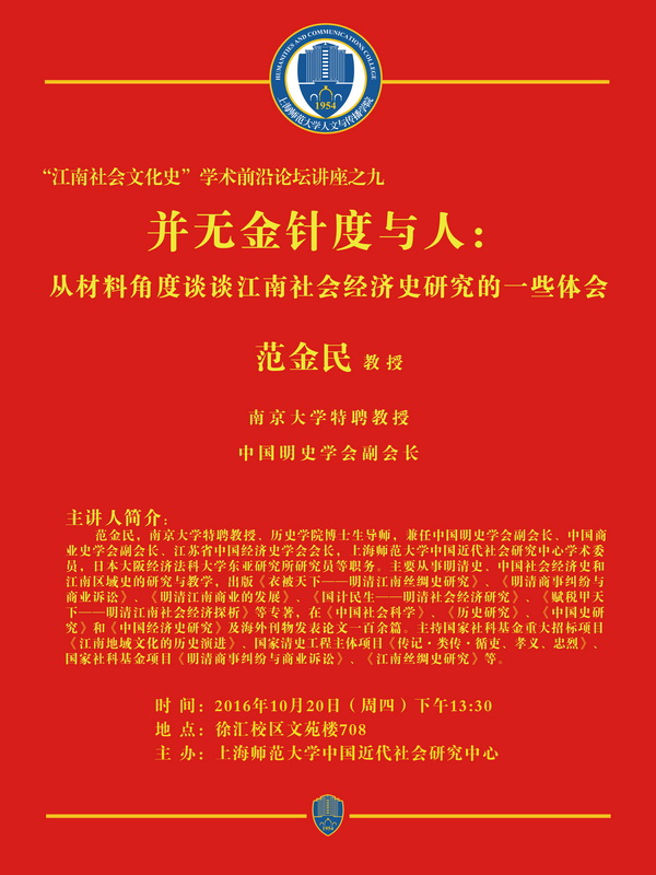 【讲座】2016.10. 20范金明:并无金针度与人:从材料角度谈谈江南社会经济史研究的一些体会(“江南社会文化史”学术前沿论坛讲座之九)