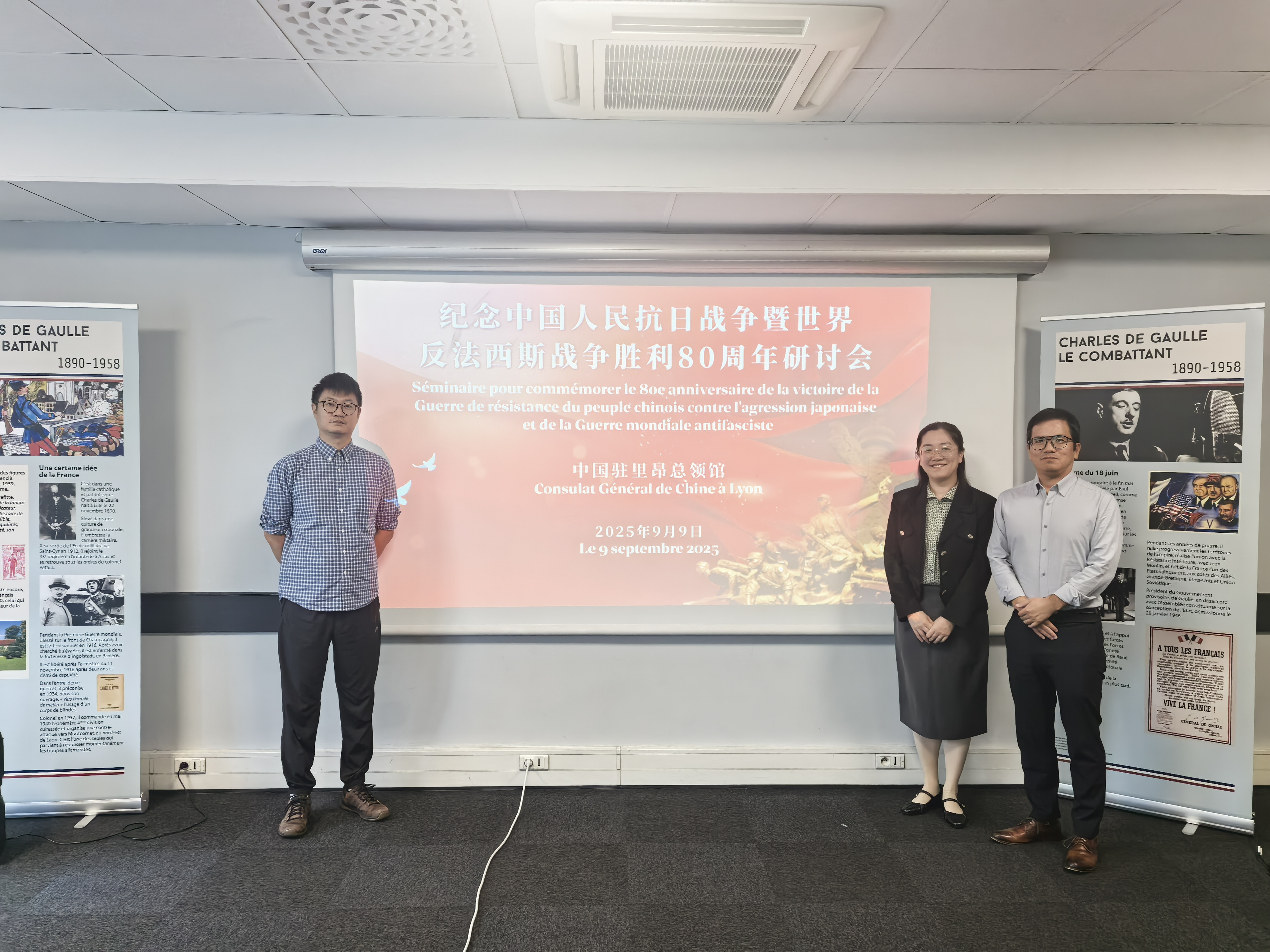 2025年9月9日,中国驻里昂总领馆成功举办纪念中国人民抗日战争暨世界反法西斯战争胜利80周年研讨会。来自中法两国的专家学者、当地政府代表、友好人士及华侨华人约50人出席。ok138cn太阳集团529副经理姚霏教授携刘峰、蒋杰两位教授应邀参会并作专题报告。此次研讨会也是继“2025中法论坛:多元视角下的第二次世界大战”在太阳成集团官方网站成功举办后,中法两国在二战历史研究与人文交流领域的又一次重要合作,形成了“双城会”的良好格局。