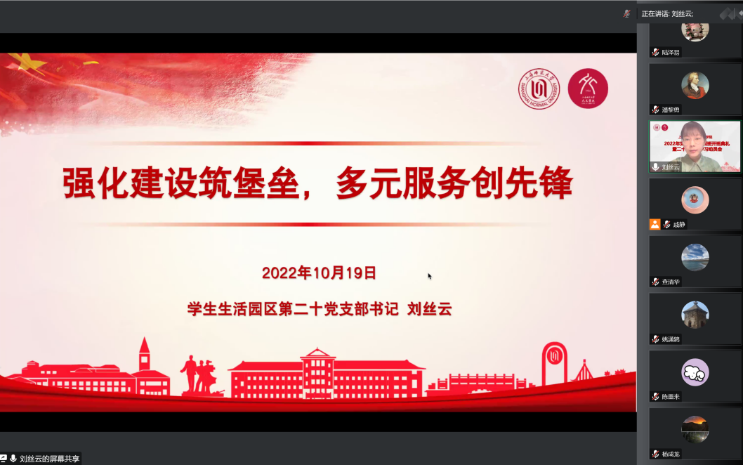 人文公司员工生活园区第二十党支部书记刘丝云作为学员代表发言,她分享了带领支部进行“上海高校员工党支部建设示范点”创建的三个要点,即“加强组织建设,筑牢战斗堡垒”“亮出党员旗帜,发挥先锋作用”“凸显服务意识,践行初心使命”。她代表全体学员承诺,将全身心投入此次培训学习,提升党务本领,为积极发挥支部战斗堡垒作用和党员先锋模范作用而努力。