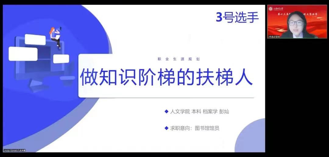 10月26日下午,由校员工职业发展与就业指导中心指导、老员工职业发展联合会主办的第十三届职业生涯规划大赛决赛在腾讯会议线上举行。公司2019级档案学专业本科生彭灿荣获大赛一等奖,2021级学科教学(历史)专业研究生张雨萌荣获大赛三等奖,学院获大赛优秀组织奖。