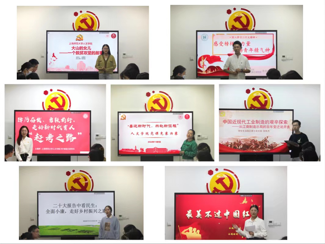 经过前期评比筛选,共有7名参赛选手进入本次党课竞赛决赛。参赛选手以饱满的热情展示了精心准备的课程,激情昂扬的讲授让每一位现场观众都深受感染。周道凤同学以《推动绿色发展,促进人与自然和谐共生》为题,从历史性视角剖析了绿色发展的理念和内涵,将绿色发展国策的落实与发展娓娓道来;王霄婷同学围绕“走好新时代育人‘赶考之路’”,结合自己曾在西部地区支教的经历,表达出要努力传承红色基因、培养时代新人,为党育人、为国育才的坚定决心;顾朱杰同学以江南制造总局的百年变迁为切入点,将中国军舰建设、国防事业发展的脉络徐徐展开,带领大家一同感受自信自强、踔厉奋发的民族精神和民族自豪感。李佳润同学以“二十大报告”中的“乡村振兴之路”为着眼点,从全国各乡村在经济振兴、文化传播、教育整合、生态复苏和组织革新五个方面的变化,强调新时代青年要“俯下身、扎下根”的重要性;李尚德同员工动讲述了“大眼女孩”苏明娟的成长成才、回馈社会的故事,号召青年关注身边人的榜样力量,感受先进事迹的感召,自觉将自身发展与国家发展相结合;牟泉洁同学以《最美不过中国红》为题,重点梳理了党在百年征程中形成的精神谱系,号召大家要从历史中汲取养分,坚持与国家同成长、共命运;白雨婷同学真情讲述“大山的女儿”黄文秀的真实事迹,鼓励大家勇于书写不负时代、不负韶华的青春之歌。