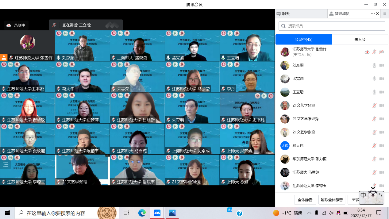 12月17日,“文心论坛”暨沪苏三校文艺学研究生学术论坛在腾讯会议成功举办。为贯彻落实党的二十大关于教育高质量发展的重要指示精神,深入践行立德树人的根本任务,推动落实“新文科”培养高素质人才的理念,进一步创新公司产品模式、提升研究生科研水平,由江苏师范大学文学院发起,联合华东师范大学中文系、ok138cn太阳集团529共同举办此次学术联谊活动。本次活动以“文艺理论:传统与现代”为主题,面向三校文艺学、艺术学专业硕士研究生征文,得到了我院文艺学专业学子的积极响应与支持,会议总收稿共计53篇,我院文艺学专业学子投稿11篇。论坛共设开幕式及线上合影、分组讨论、闭幕式三个环节。