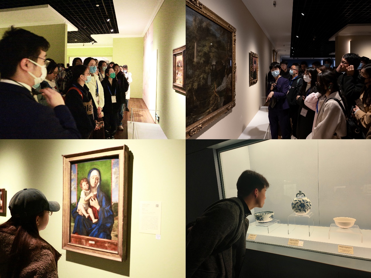 在上海博物馆一楼的第一展览厅内,陈列着52件来自欧洲艺术大师们的油画杰作。在上海博物馆专业讲师细致讲解的引导下,同学们用心感受着每一件艺术作品背后的故事,欣赏着波提切利、拉斐尔、提香等艺术史中大师们的杰作,对于欧洲艺术流派从15世纪至19世纪的发展脉络有了感性的认识。在上海博物馆四楼,同学们浏览了“NG Treasures 再现·大师|沉浸式光影体验”展,在数字展陈中感受着梵高的《向日葵》、莫奈的《睡莲》、达·芬奇的《岩间圣母》等作品的魅力,在动画特效与光影技术的交互中,沉浸式地感受着艺术的神奇价值。