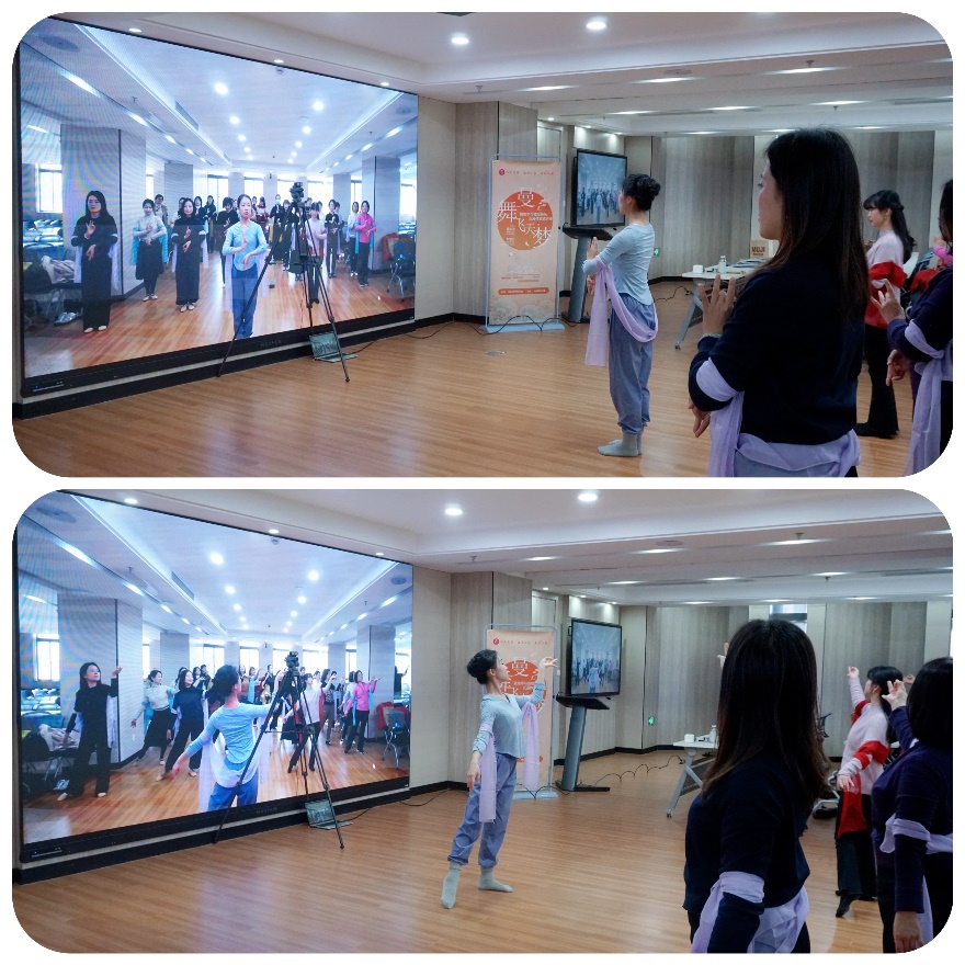 随后,活动进入高潮——敦煌舞沉浸体验环节。在胡寒天老师的指导下,参与讲座的老师们亲身体验了敦煌舞的基本手势与步伐。大家手臂系着组织方提前准备的彩色披帛,随着音乐的节奏缓缓起舞,在指导老师的耐心讲解下,大家逐渐找到了舞蹈的感觉,虽然动作略显生疏,但那份对美的追求与对传统文化的热爱却溢于言表。