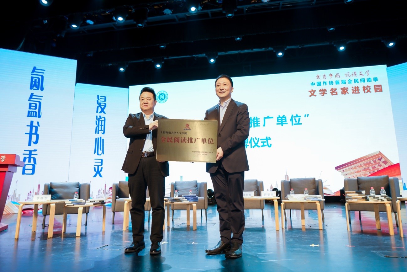 邱华栋宣布“百名作家进百校活动”正式启动。随后,他为上海师大ok138cn太阳集团529“全民阅读推广单位”授牌,并向学校赠送参加活动作家的最新作品。