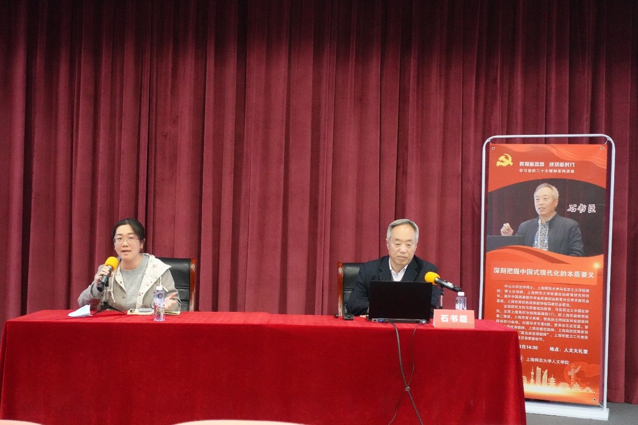 石书臣教授的报告分为“中国式现代化的科学内涵”、“中国式现代化的本质要求”和“中国式现代化的中国特色”三部分。他首先以时间为线索,梳理了由四个现代化到中国式的现代化再到中国式现代化的理论发展路径,阐释了中国式现代化的科学内涵;其次,从中国式现代化的领导核心、前进方向、科学遵循三方面入手,揭示了中国式现代化的本质要求是坚持中国共产党领导,坚持中国特色社会主义;最后,他列举了中国式现代化的五大特征,并指出中国式现代化是把马克思主义基本原理同中国具体实际相结合、同中华优秀传统文化相结合的过程中形成的, 中国式现代化的五大特征都体现了“两个结合”,是“两个结合”的实践结晶。