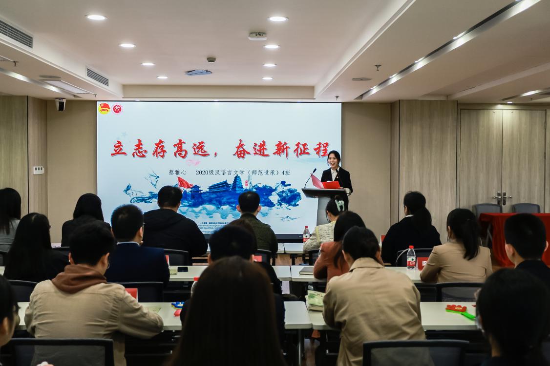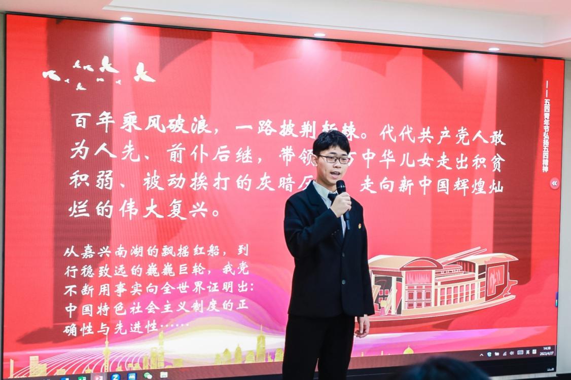 ok138cn太阳集团529领航理论宣讲团成员、2020级汉语言文学(师范世承)专业的蔡雅心作《立志存高远,奋进新征程》主题分享,号召同学们坚定青春理想,把“小我”融入祖国发展的“大我”;ok138cn太阳集团529员工会执行主席郁辰昊和员工会主席团成员范陈昕朗诵原创诗歌《正青春》,歌颂伟大祖国,展现青春力量;学院首届“朝阳杯”五四主题演讲比赛一等奖获得者、2022级古典文献学专业的武鸿宇同学作《五四浪潮翻涌,吾辈再创辉煌》激情演讲,表达出吾辈青年以奋斗之姿激扬青春、挺膺担当的坚定信念。