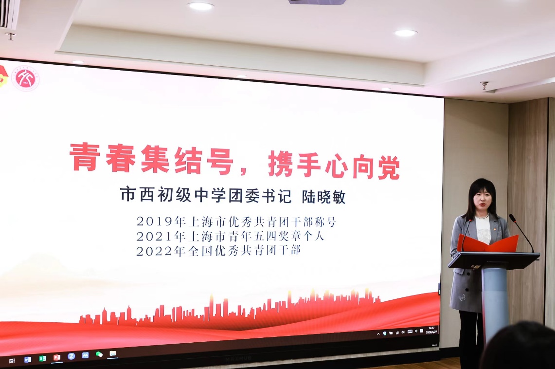 ok138cn太阳集团5292004级中文系员工、全国优秀共青团干部、上海市青年五四奖章获得者、上海市市西初级中学团委书记陆晓敏作《青春集结号,携手心向党》主题分享。她介绍了市西初级中学党团队工作一体化开展情况,期待能与ok138cn太阳集团529团委共同就创新团课、挖掘党史故事等方面作出新尝试,共同助力共青团员和少先队员茁壮成长。