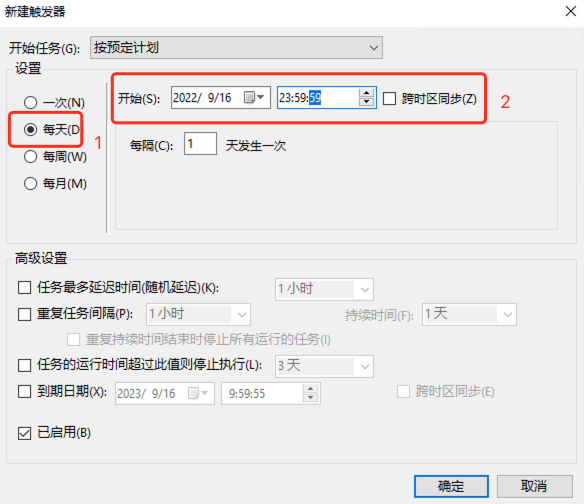 4、在“触发器选项卡”里,点击底部的“新建”,时间设置为“每天”的某个时间,比如晚上11点59分。(根据实际需要设置)