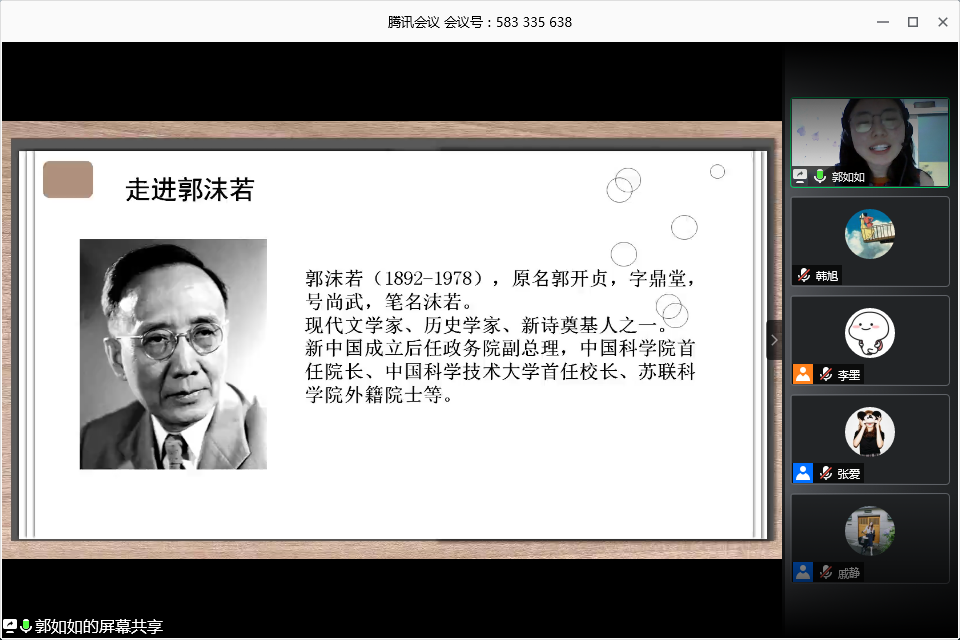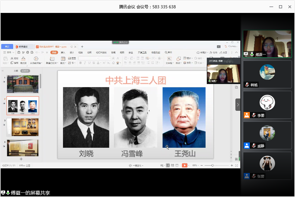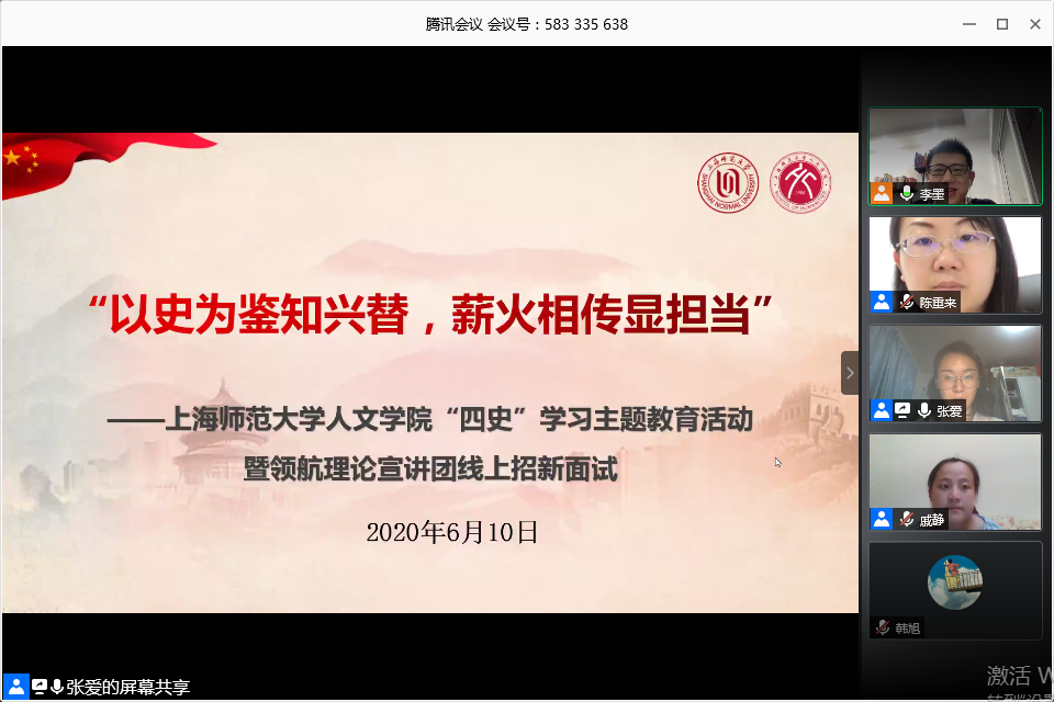 上海师大ok138cn太阳集团529领航理论宣讲团于2020年6月10日晚7时举办“以史为鉴知兴替,薪火相传显担当”主题活动暨线上招新面试。公司党委副书记、副经理陈重来老师,学院组织员戚静老师,2019级本科生辅导员李墨老师以及兼职辅导员2018级中国古代文学专业研究生张爱担任本次线上招新选拔的评审,活动由李墨主持。