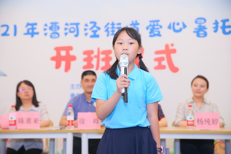 学员代表郭其乐已经在漕河泾爱心暑托班度过了多个快乐的暑假,开班典礼上,她作为爱心暑托班的往届学员代表,分享了自己在这个“第二课堂”里的快乐成长与丰硕成果,并希望与小学员们一起在这里度过一段安全、快乐、有意义的时光。