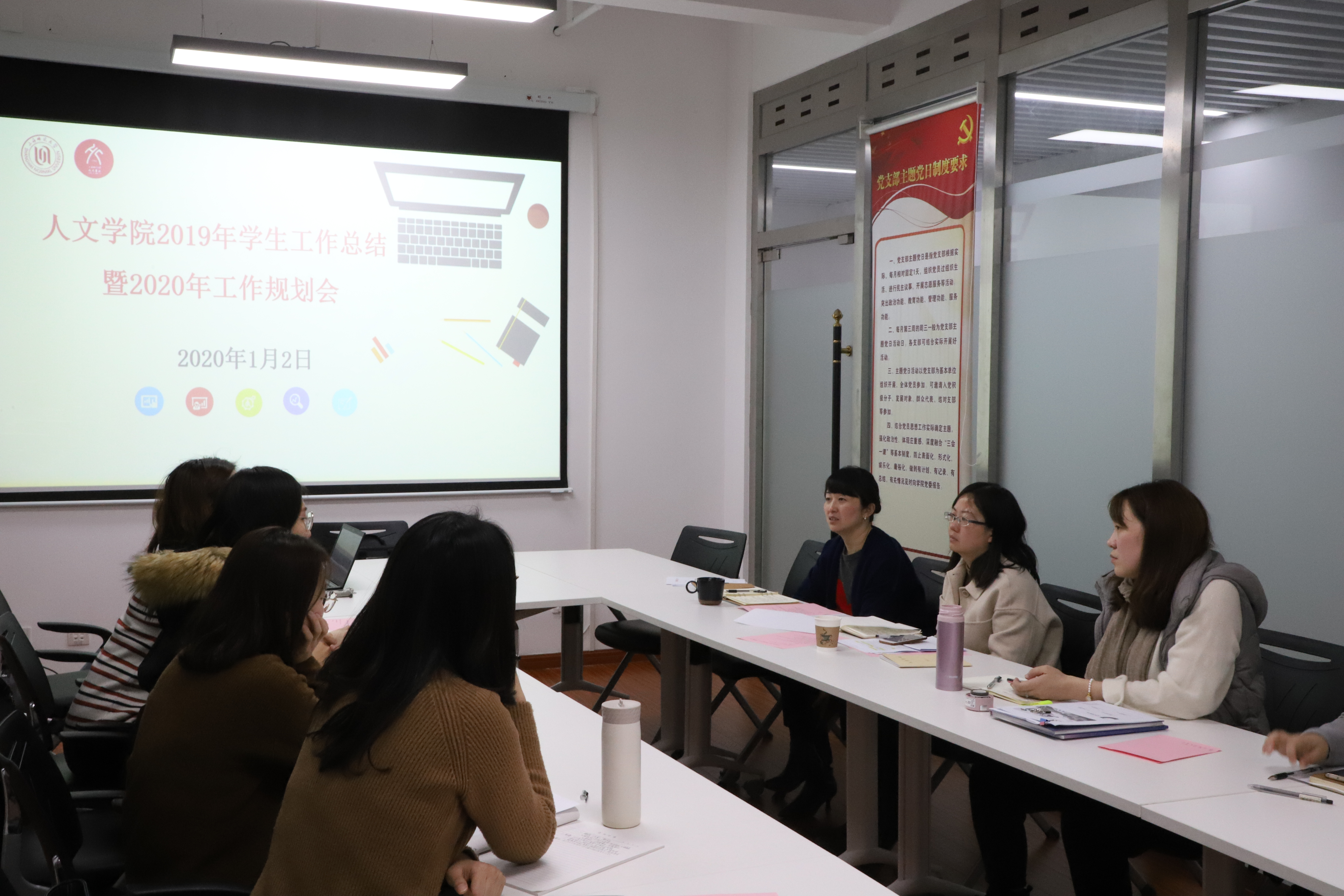 辅导员王雅婷、黎倩仪、吴玮、戚静、朱倩云、谭苇禾、曹小艺一一结合个人本年度参加辅导员培训收获以及2020年工作板块规划进行展示,就复旦高研班的学习体会、人文研究生就业数据分析、构建高校“三全育人”新格局、心理专项总结与展望、员工党建工作规划与设想、激活思政工作内生动力、资助与义工队升级、园区工作思考计划等作深入探讨。陈重来对各辅导员版块发言作点评及互动。