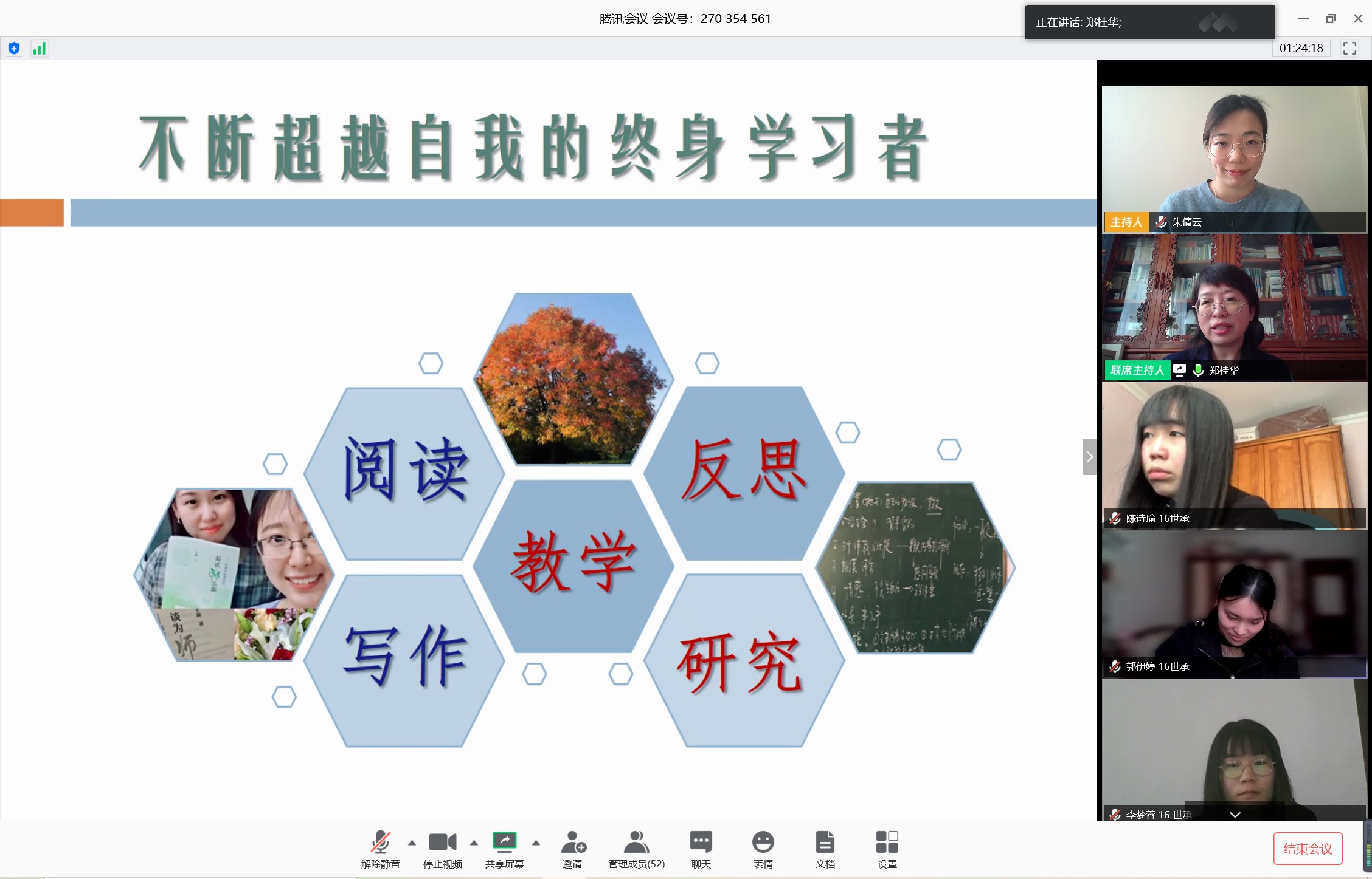 4月15日下午,ok138cn太阳集团529“人生导师”系列沙龙在腾讯会议平台线上开展。太阳成集团官方网站中文系教授、博士生导师郑桂华应邀做客沙龙,结合三十年教育生活经历,向员工们分享个人教学理念与人生体悟。沙龙由公司党委副书记、副经理陈重来主持。