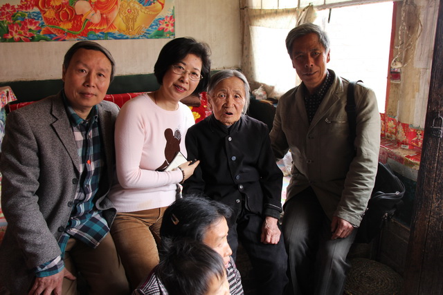 苏智良、陈丽菲、当地志愿者张双兵与张先兔大娘合影(2014年4月18日摄)