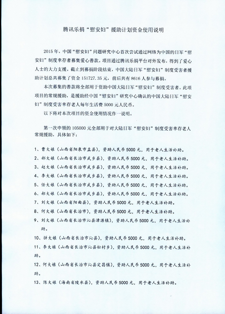 腾讯乐捐“慰安妇”援助计划资金使用说明